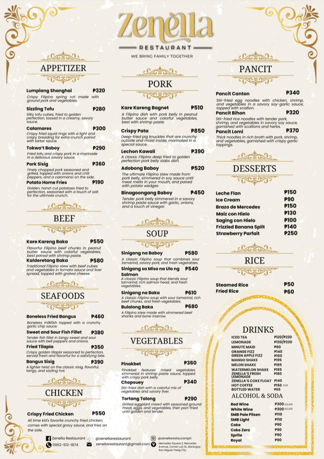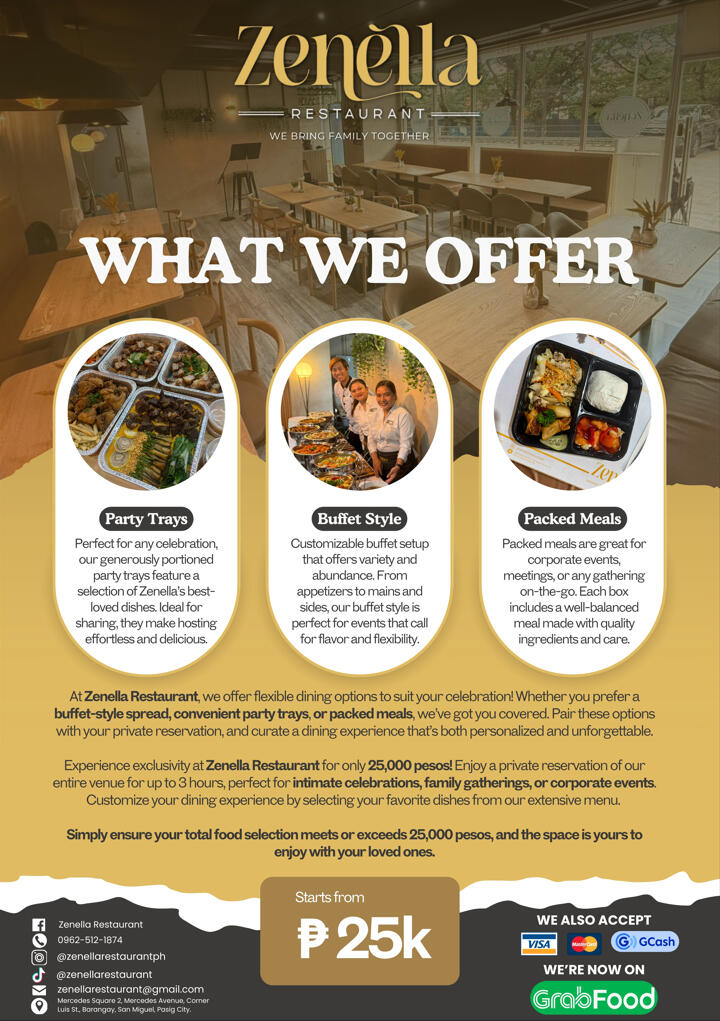 If you're thinking of where to spend your special day, Zenella Restaurant welcomes you home!At Zenella Restaurant, we offer flexible dining options to suit your celebration! Whether you prefer a buffet-style spread or convenient party trays, we’ve got you covered. Pair these options with your private reservation, and curate a dining experience that’s both personalized and unforgettable.Experience exclusivity at Zenella Restaurant for only 25,000 pesos! Enjoy a private reservation of our entire venue for up to 3 hours, perfect for intimate celebrations, family gatherings, or corporate events.Customize your dining experience by selecting your favorite dishes from our extensive menu. Simply ensure your total food selection meets or exceeds 25,000 pesos, and the space is yours to enjoy with your loved ones.For more details, feel free to reach out to us! Send us a message on our Facebook page or email us at [email protected].